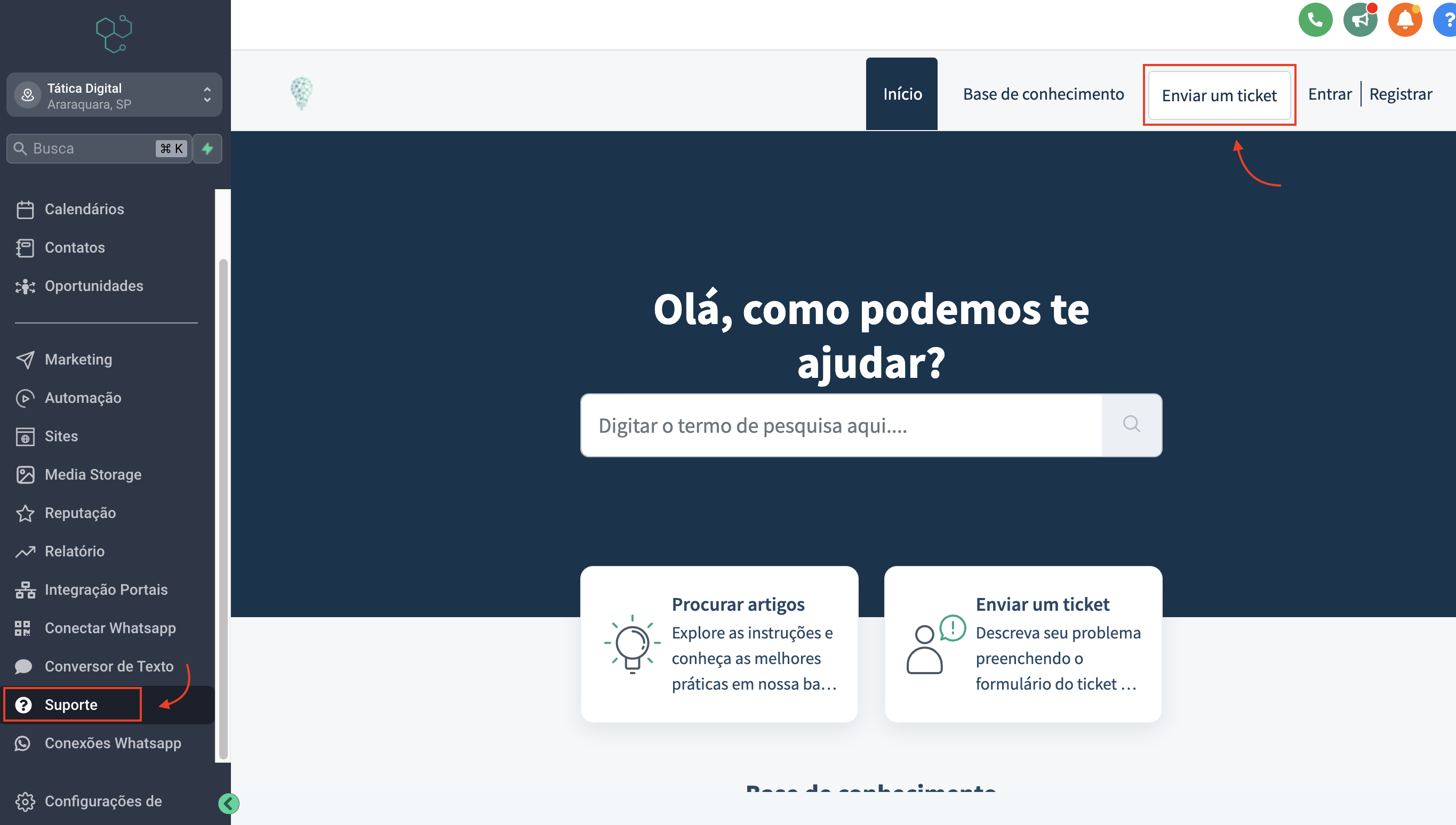 Passo 1: Dentro do Tática Leads, no menu à esquerda, clique na opção Suporte. Na tela que irá carregar, clique no botão Enviar um ticket. Caso não esteja dentro do Tática Leads, registre o chamado clicando aqui.